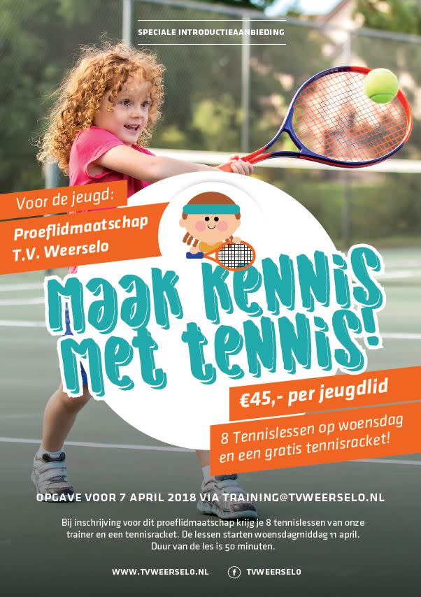 Voor de jeugd hebben we een mooie aanbieding om kennis te maken met tennis. In de week na pasen wordt de flyer op de basisschool aan alle leerlingen uitgedeeld.