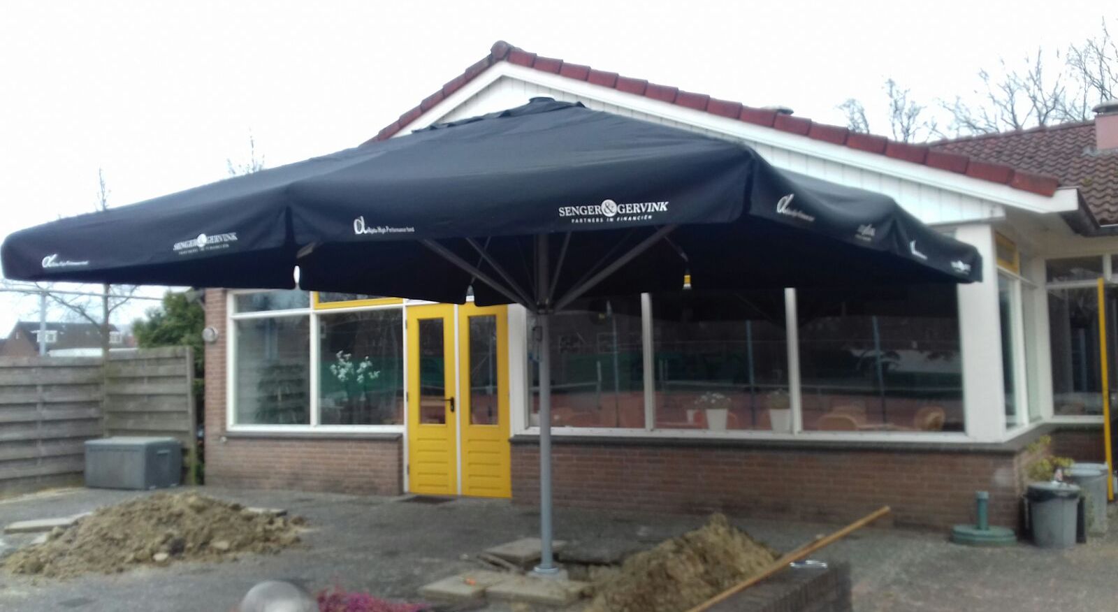 Vandaag is een start gemaakt met de plaatsing van twee grote parasols voor het clubhuis. De parasols, beide met een afmeting van 5m x 5m, komen in een vaste verzonken voet te staan. Ook wordt LED verlichting en worden heaters onder de parasols geplaatst.